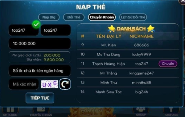 - Chọn phương thức nạp tiền phù hợp từ ngân hàng, ví điện tử, hoặc thẻ cào.